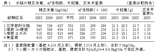 表1 水稲の精玄米重、m2当籾数、千粒重、玄米中窒素(窒素は乾物当)