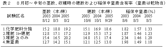 表2 8月初〜中旬の茎数、収穫時の穂数および稲体中窒素含有率(窒素は乾物当)