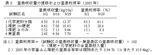 表3 窒素吸収量の推移および窒素利用率(2005年)
