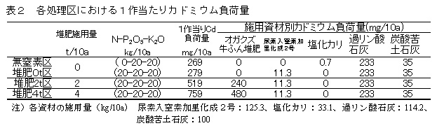熊本県における堆きゅう肥施用基準に基づいてオガクズ牛ふん堆肥(2〜4t/10a)を施用した場合、0.24〜0.48g/10aのカドミウムが負荷される(表2)。