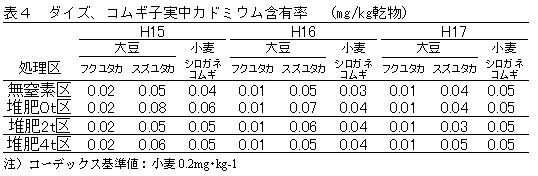 小麦(シロガネコムギ)および大豆(フクユタカ、スズユタカ)子実中のカドミウム含有率は、オガクズ牛ふん堆肥を連用しても堆肥を施用していないほ場で栽培した場合と同等である(表4)。