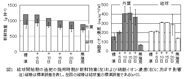 図1 結球開始期の追肥の施用時期が新鮮物重(左)および硝酸イオン濃度(右)に及ぼす影響