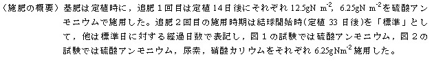 - ハクサイの慣行施肥体系(基肥-追肥2回)において、結球開始期に施用する追肥窒素の10日以上の遅れは、結球重を減少させるだけでなく、結球中の硝酸イオン濃度の上昇をもたらす。特に、硝酸系肥料の使用は硝酸イオン濃度の上昇を助長する。