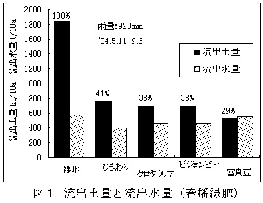 1)緑肥を栽培すると、裸地区に対し、流出土量を41〜29%に抑制することができる。流出水量は裸地区で最も多いが、流出土量の最も少ない富貴豆区でも流出水量が同程度の流出量であることから、富貴豆区は土壌を保持する能力が高い(図1)。
