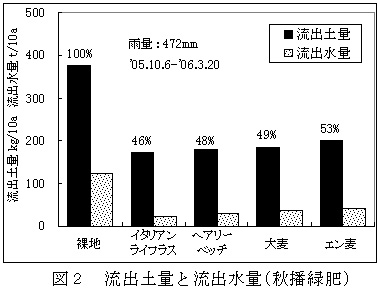 1)緑肥を栽培すると、裸地区に対し流出土量を各緑肥区で46〜53%に抑制することができる(図2)。