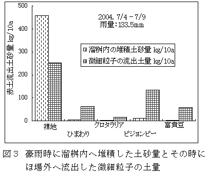 2)豪雨時の溜枡内の土量は裸地区で多量の土砂が堆積しているが、各緑肥区とも3%以下である。裸地区では礫や砂等の土砂が多量に流出しているが、各緑肥区はほとんがシルト以下の微細粒子である(図3)。