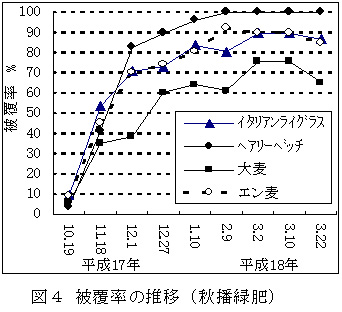 2)被植率は大麦以外は高い傾向を示し、播種後2〜6ヶ月程度は高被植率で推移するため、赤土流出防止効果が高い(図4)。