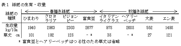 3)ヘアリーベッチとエン麦は生育や収量が良好だが、イタリアンライグラスと大麦は生育・収量が少ない。(表1)。