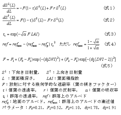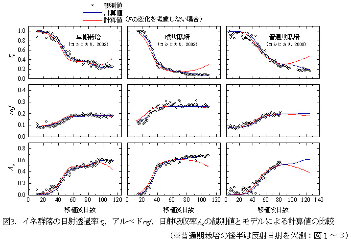 図3 イネ群落の日射透過率τc, アルベドref, 日射吸収率Ac の観測値とモデルによる計算値の比較