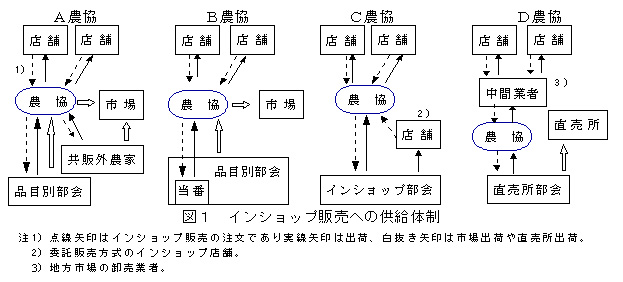 インショップ販売に取り組む農協は、産地の規模に応じた供給体制をとっている。A農協は店舗からの注文に対し、品目別部会と共販外農家から市場価格で農協が買取ることによって品揃えを行っている。B農協は各品目別部会内にインショップへ出荷する当番を設置し、一週間ごとに交代で出荷している。A、B農協は既存の部会から市場向けに生産された品目をインショップへ供給している。C農協はインショップ販売に合わせた部会を新たに組織し、店舗と協議して作付けを計画している。D農協は直売所部会の一部の農家に注文数量を割り当てることで品揃えを行っている。また、店舗への出荷計画や受注の処理、小口配送の手配、代金回収等を中間業者に委託することで、農協の販売業務の負担を小さくしている(図1)。