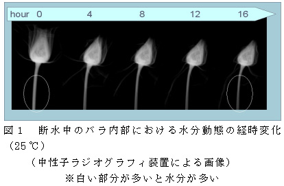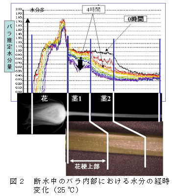 図1 断水中のバラ内部における水分動態の経時変化(摂氏25度)