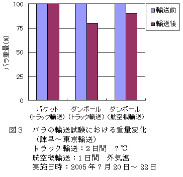 - 夏季のバラ輸送において、バケットを用いたトラック輸送の場合は、市場到着時の重量がほとんど変化していないため、ベントネックも発生しない。ダンボール箱を使用した場合は、バラの重量は、トラック輸送で約20%、航空機輸送で約10%減少する(図3)。トラック輸送では約20%がベントネックを起こす。