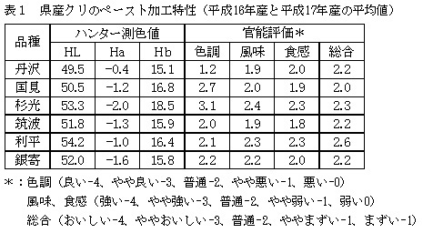 表1 県産クリのペースト加工特性(平成16年産と平成17年産の平均値)