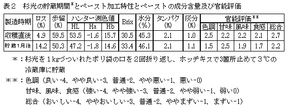 - 「杉光」は貯蔵(摂氏3度)1ヶ月で、原料ロスが増え歩留りが低下する。また、貯蔵によりペーストのBrixが増加し甘味が増すが、最大の特徴である色調が低下し、風味や食感も低下するので、収穫後速やかに加工する必要がある(表2)。