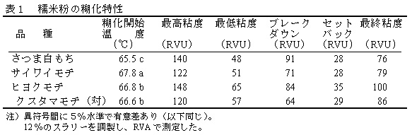 「さつま白もち」は、餅の硬化速度と相関の高い糊化開始温度が、表1に示す代表的な県内栽培品種の中で最も低い(表1)。