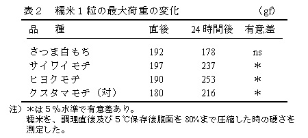おこわ等蒸し米へ用いた場合、他品種は24時間で硬くなるのに対し、「さつま白もち」は24時間後の硬さの変化は少ない(表2)。