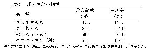 求肥生地の硬さは、国内で最も加工適性の評価の高い「こがねもち」、「はくちょうもち」より柔らかく、生地の伸びも良い(表3)。