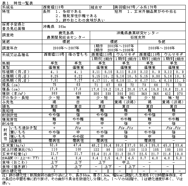 - 「西南糯118号」は暖地では早生に属し、多収で穂発芽性難の糯系統である。餅やおこわに加工した場合の食味が良い。