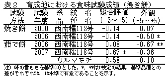 表2 育成地における食味試験成績(搗き餅)