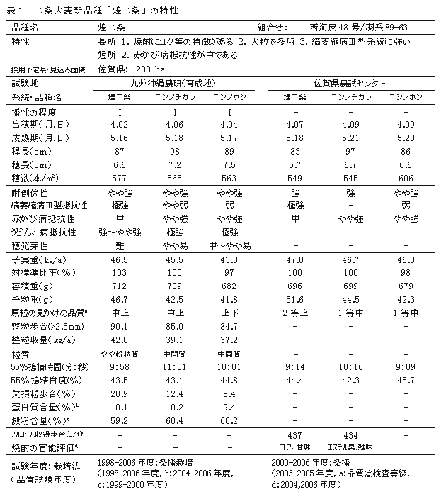 - 二条大麦新品種「煌二条」は、焼酎醸造適性が良く焼酎の酒質に特徴があり優れる。千粒重と整粒歩合が大きく整粒収量が高い。オオムギ縞萎縮病ウイルスのI、III型系統に強く、穂発芽性が難である。
