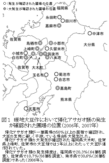 ![]() 図1 暖地大豆作において帰化アサガオ類の発生 が確認 された圃場の位置(2006年、2007年) |