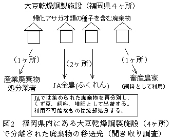 ![]() 図2 福岡県内にある大豆乾燥調製施設(4ヶ所)で分離 された廃棄物の移送先(聞き取り調査) |