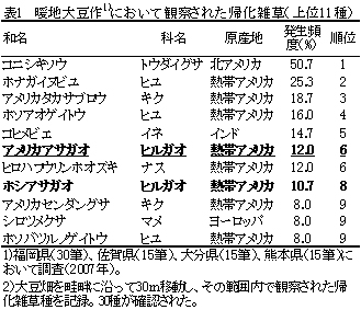 ![]() 表1 暖地大豆作1)において観察された帰化雑草(上位11種) |