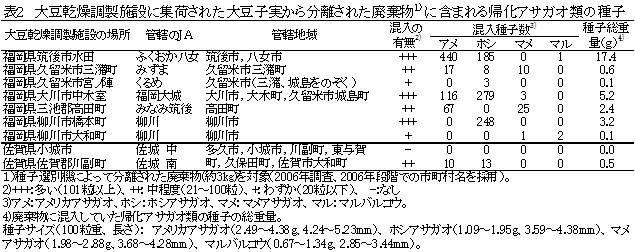 表2 大豆乾燥調整施設に集荷された大豆子実から分離された廃棄物1)に含まれる帰化アサガオ類の種子