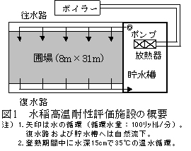 - そこで、高温耐性評価施設(図1)による登熟期間中の温水処理(35℃の温水循環)が玄米品質に及ぼす影響について検討し、高温登熟性に優れる品種を効率的に選抜する方法を明らかにする。