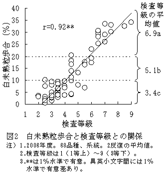 白未熟粒歩合は10%未満では1等〜2等上に品位格付けされる品種、系統の割合が高く、高温登熟性の選抜指標として有効である(図2)。