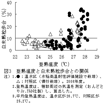 出穂後20日間の平均気温(以下、登熟温度)が27℃を超えると、白未熟粒歩合が著しく増加する(図3)。