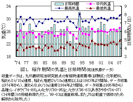 図1 稲作期間の気温と日照時間(筑後気象データ) |