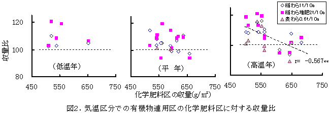 階級区分毎に収量比をみると、麦わら区の多照年を除いて、いずれの気象条件でも有機物連用区では化学肥料区より高く、稲わらや稲わら堆肥の連用は、通常の年だけでなく、低温年や寡照年、および最近問題となっている高温年でも、増収効果が高い(表2)。