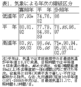筑後研究拠点における1974年以降の稲作期間(6/25-10/15)の気温の推移を見ると、最高気温と平均気温、最低気温はほぼ同じ傾向で、90年代以降上昇傾向を示す(図1)。また、日照時間は、最高気温(r=0.68**)や平均気温(r=0.49**)と正の相関関係(1%水準で有意)を示す。日照時間と相関のない最低気温と、日照時間を軸として各年次を分類すると、表1のようになり、1998年以降は全て高温年である。