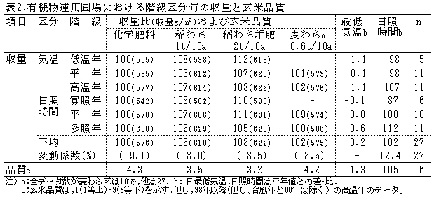 表2 有機物連用圃場における階級区分毎の収量と玄米品質