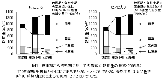 「にこまる」では「ヒノヒカリ」に比べて、登熟期間の乾物生産量が少ないが、登熟前半における茎重と茎内のNSC含量の減少が著しく(図1)、穂揃期に茎に貯めているNSCを転流することで穂重増加を確保しているとみられる。