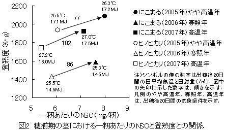 図2 穂揃期の茎における一籾あたりのNSCと登熟度との関係