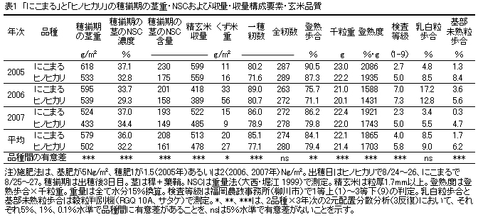 「にこまる」では「ヒノヒカリ」に比べて、穂揃期の茎重が大きく、茎のNSC濃度も高いために穂揃期の茎のNSC含量が多い(表1)。