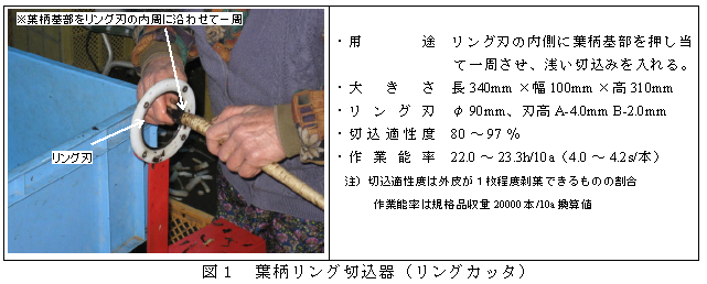 ゴボウの葉柄剥葉は、葉柄基部の外周にリング状の切込みを入れる事で剥葉が容易となる。本器具は、リング形状の丸刃の内側に添って葉柄基部を押し当てながらゴボウ自体を回転させることなく一周させる事で切込みを入れるもので、切込み線のずれが少なく包丁で行う従来作業に比べ疲労が少ない。作業能率は10a(20000本換算)当たり22〜23.3時間である(図1)。