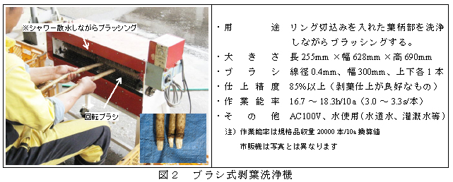 本機は葉柄基部にリング切込みを施したものを、上下一対のロールブラシで水洗いをしながらブラッシングして剥葉と洗浄仕上げを行うもので、作業能率は10a当たり16.7〜18.3時間である(図2)。