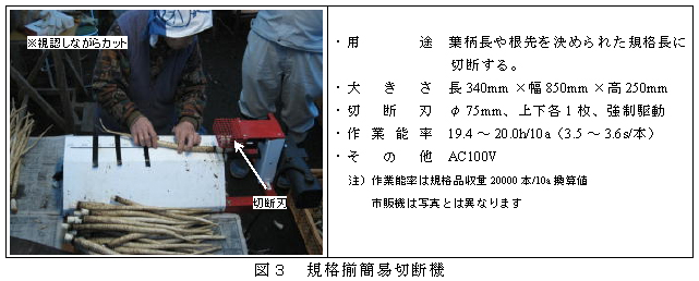 本機は剥葉を行った葉柄部と根先の切断を行う簡易切断機で、作業能率は10a当たり19.4〜20.0時間である(図3)。
