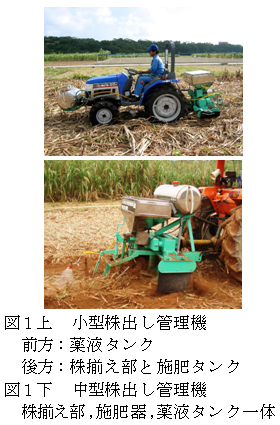 サトウキビ株出し管理の時期は、収穫、植付けおよび施肥や除草剤散布作業が重なり、農家にとっては最も多忙な時期である。従来の小型株揃え機は15kW級トラクタに搭載し、株揃え作業のみ行う機種であるが、施肥、除草剤散布を同時に行う効率的な株出し管理機として改良する。また、33kW級トラクタ装着型中型株揃え機は、株揃えおよび施肥作業が可能な機種であるが除草剤散布機を装着し、3作業同時可能な株出し管理機として改良する。