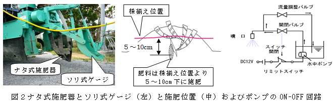 図2 ナタ式施肥器とソリ式ゲージ(左)と施肥位置(中)およびポンプのON-OFF回路