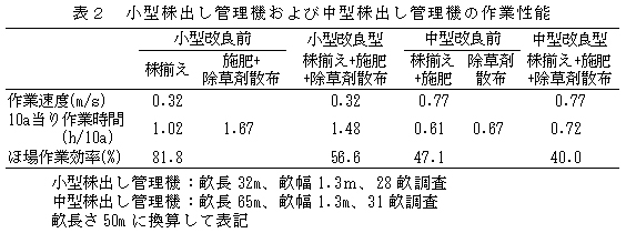 表2 小型株出し管理機および中型株出し管理機の作業性能