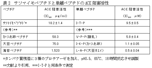 表2 サツマイモペプチドと単離ペプチドのACE阻害活性