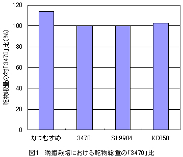 晩播栽培における乾物総重、乾雌穂重および乾雌穂重割合は、「3470」「SH9904」および「KD850」より高い。総体の推定TDN含量およびTDN収量は、「3470」「SH9904」および「KD850」より高い(表1、図1)。