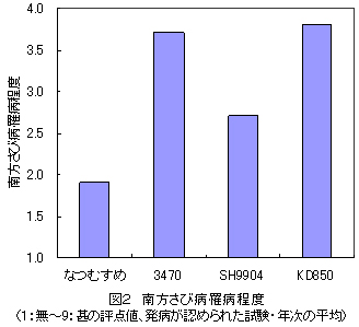南方さび病抵抗性は「3470」「SH9904」および「KD850」より強い(図2)。ごま葉枯病抵抗性は、「3470」並かそれより強く、「SH9904」および「KD850」並かそれよりやや弱い(表2)。