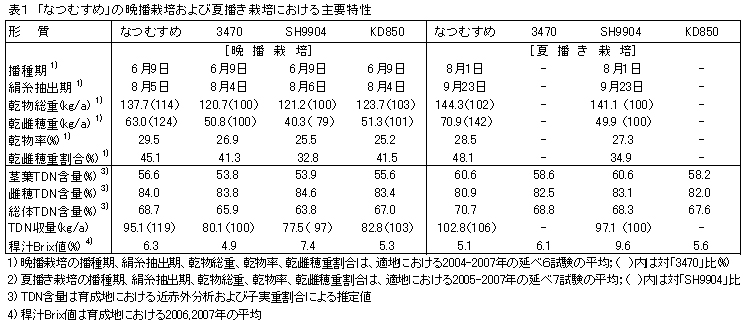 表1 「なつむすめ」の晩播栽培および夏播き栽培における主要特性