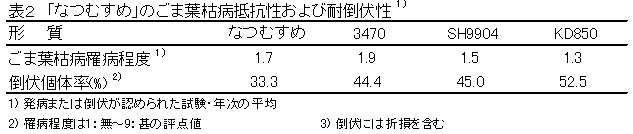 表2 「なつむすめ」のごま葉枯病抵抗性および耐倒伏性 1)