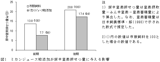 ミカンジュース粕15%添加飼料は尿中窒素排せつ量を肥育前期において約40%、肥育後期において約15%減少させる(図1)。